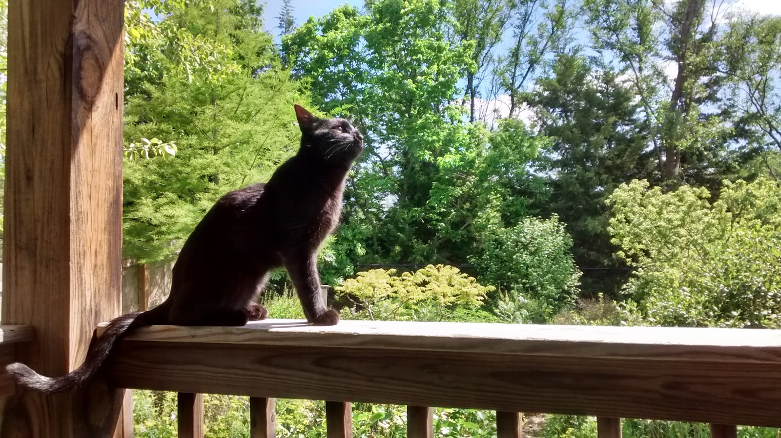 Two weeks ago I heard a calling from under the ceder trees. I swear, local cats must put hobo signs on our fence. There he was, a scrawny kitten about 4 months old, meowing his head off. Of course I befriended him. He'll sleep on my lap purring for as long as I can hold still (current record 45 minutes), follow me around to check on plants, and he loves chasing sticks and eating grass. I'm not sure he often leaves our garden as he's always there when I go out. He is extremely docile and not yet a hunter or fully adapted to outdoor life, so I'd like to find him a good home before he decimates birds or becomes feral.
